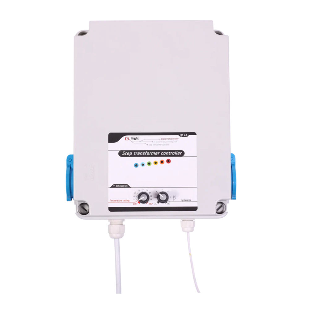 Степ (стъпков) трансформатор със специална характеристика, позволяваща на вентилаторите да не произвеждат шум на ниски скорости. Степ трансформаторът контролира скоростта на вентилаторите чрез 6 степенна система, зависима от влажността и температурата на помещението. Температура и хистерзис (чувствителност) се настройват посредством два потенциометъра. Влажност и хистерзис - влажност се настройват от другите два потенциометъра. Входящият вентилатор работи с една стъпка назад от изходящият вентилатор, за да предотврати изпускането на миризми. Пример: Изходящият вентилатор работи на степен 1, входящият работи на степен 0 (изключено). Когато изходящият вентилатор превключи на степен 2, входящият вентилатор превключва автоматично на степен 1 и така нататък. Когато изходящият вентилатор достигне максималните си стойности (степен 6), входящият вентилатор вллиза в работен режим на степен 5. Контролерът пристига като краен продукт, готов за употреба. Корпусът на контролерът е напълно водонепроницаем, контактите имат изолирани капаци и уреда има сензор за ниско напрежение, което го прави перфектен избор за помещения с висока влажност. Сензорът пристига с кабел, дълъг 4 метра. Размери и технически данни: Кутия: 200x250x180mm Контролер: 265x300x205mm Проектиран за: 8A (за 2 вентилатора) Първична намотка: 230V / 50HZ Вторична намотка 80V, 110V, 140V, 170V, 200V, 230V автоматизирани стъпки 50HZ Дигитален сензор 5V, измерващ температури от –55°C до +125°C (–67°F до +257°F) 0.5°C точност от –10°C до +85°C Влажност с точност: ±4.5%rh Защитен клас: IP54 Обхват на настройките: Температура: 20C° - 30C° Хистерзис - температура: 2-8C° Влажност: 30% - 100% Хистерзис - влажност: 6%-30% Инструкции за употреба *Сваляне от официалният сайт на GSE*: http://www.g-systems.eu/products/fancontrolers.html?page=shop.getfile&file_id=249&product_id=81 Гледайте онлайн видео упътването тук: [embed]https://www.youtube.com/watch?v=9CPzYuIfE8A&feature=youtu.be[/embed]