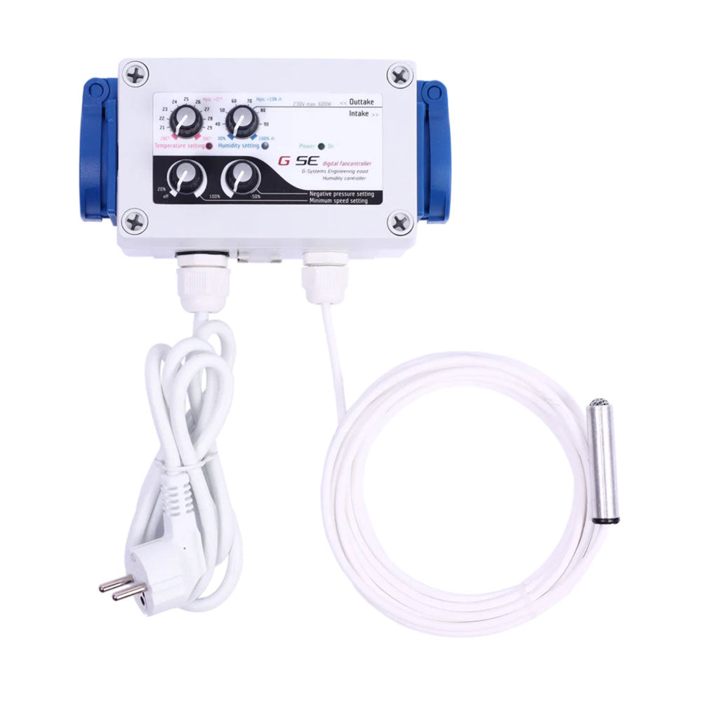 Този дигитален контролер за вентилатори, контролира скоростта спрямо влажността и температурата в помещение с изходящо и входящо течение на въздух. Контролерът поддържа влажността и температурата в помещението постоянни и под негативно налягане, за да предотврати изпускането на миризми. Контролирането е много лесно. Достатъчно е да настроите желаните влажност, температура, минимална скорост и негативно налягане във вашето помещение чрез потенциометрите. Три LED светлини показват работният статус.