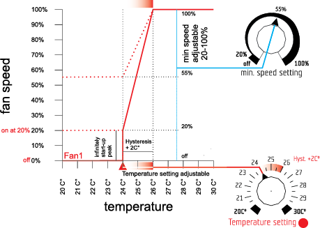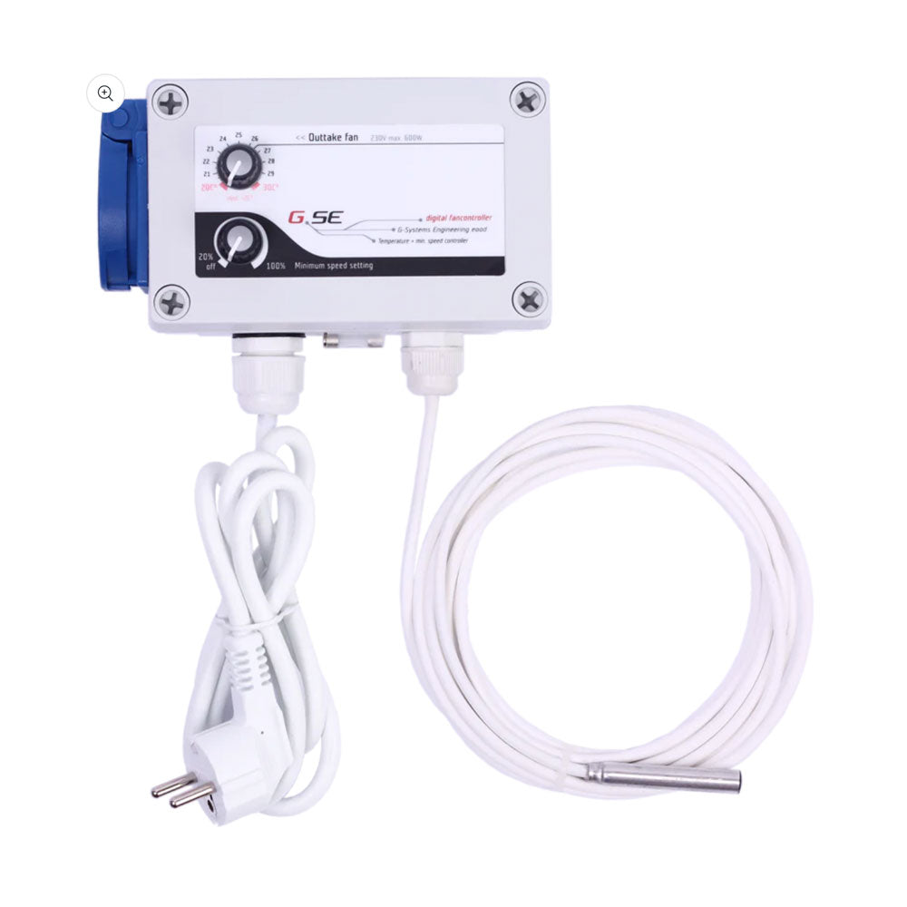 Контролерът за минимална скорост е контролер, определящ скоростта спрямо температурата за вентилиране на помещения с един или повече вентилатори. Контролерът за минимална скорост поддържа постоянна температура и изключва падането на температурата под зададената на контролера. Контролирането е много лесно! Настройте желаната температура и минимална скорост на двата потенциометъра на таблото. Контролерът пристига като завършен продукт и е лесен за употреба. Корпусът на контролера за вентилатори е запечатан херметически, контакти с протективни капаци и ниско волтажен сензор, което го прави перфектен за по-влажни пространства. Сензорът идва с 4 метра кабел, който може да бъде удължен до 50 метра. Размери и технически данни: Кутия: 130x80x70 mm Контролер: 160x100x90 mm Предназначен за: 1A / 200W / TRIAC 1x16A Волтове: 230V / 50HZ дигитален сензор 5V, мерещ температурройка: Температура: 20C° до -30C° Минимална скорост: изключен, 20% до 100% User Manual PDF: Manual_GSE_fancontrollerи от –55°C до +125°C (–67°F до +257°F) 0.5°C обхват от –10°C до +85°C Защитен клас: IP54 [embed]https://www.youtube.com/watch?v=F-bUmEpC9Zw&feature=youtu.be[/embed]