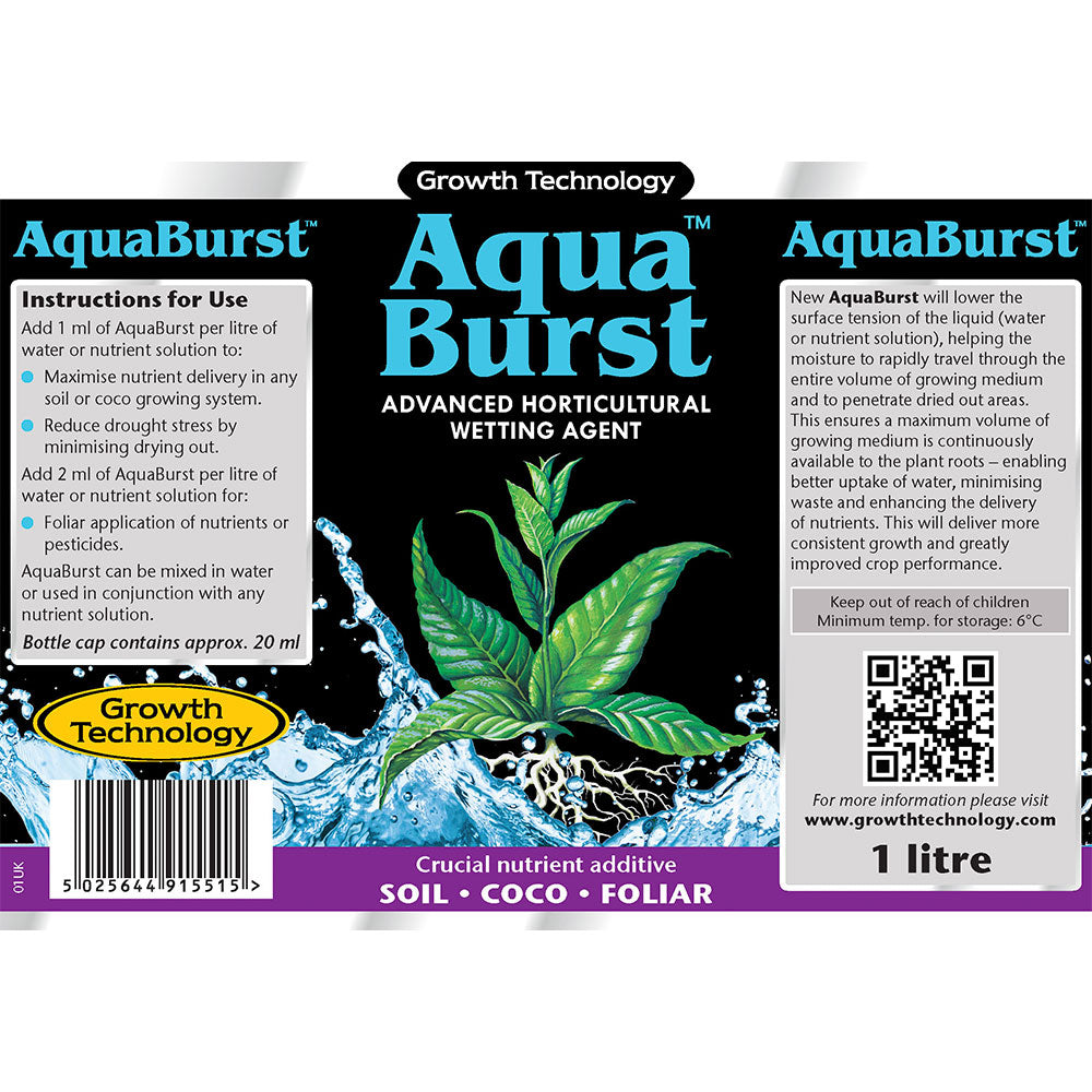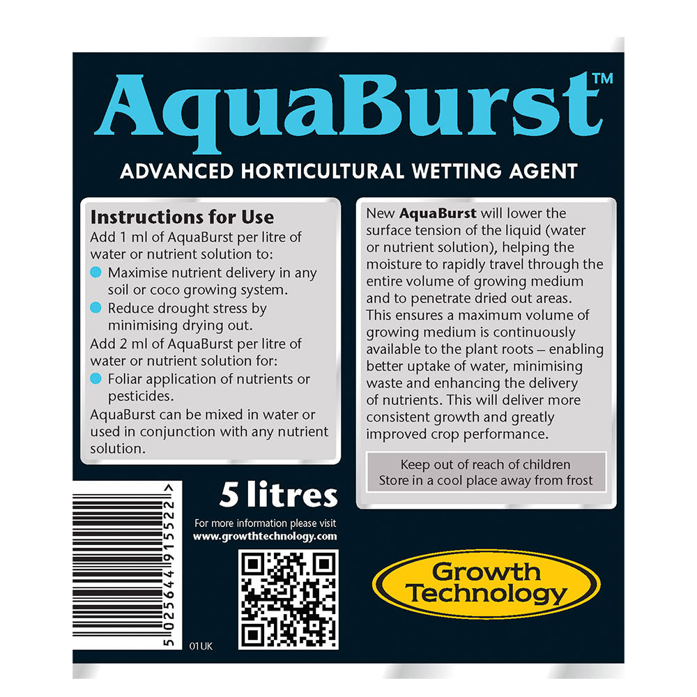 Aqua Burst помага на водата да се рапредели бързо през целия обем на субстрата, като непрекъснато достига корените на растението - позволява по-добро усвояване на водата, минимизира отпадъците и подобрява доставянето на хранителни вещества. Това ще осигури последователен растеж и значително подобрена производителност на реколтата. Увеличете максимално доставянето на хранителни вещества във всяка почва или система. Намалете стреса, като минимизирате изсушаването.