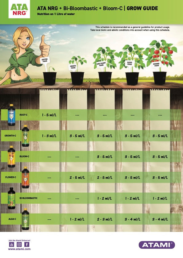 Серията АТА NRG на Atami е разработена специално за растениевъдите, които държат на органичния произход. Oрганичният тор води до най-добри вкусове и аромати. Growth-C е основен тор на базата на органични материали като морски растения. Той съдържа множество аминокиселини, микроелементи, витамини и растителни хормони.
