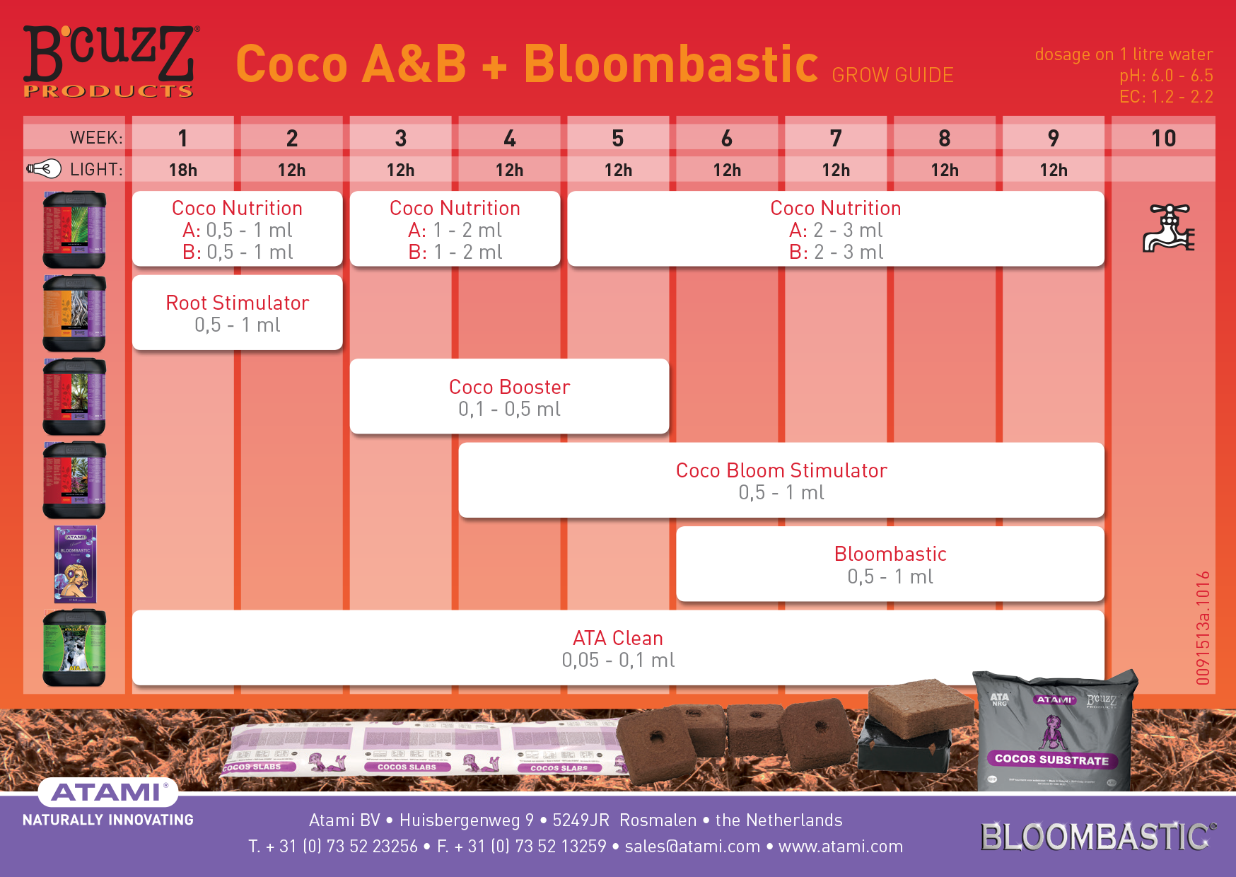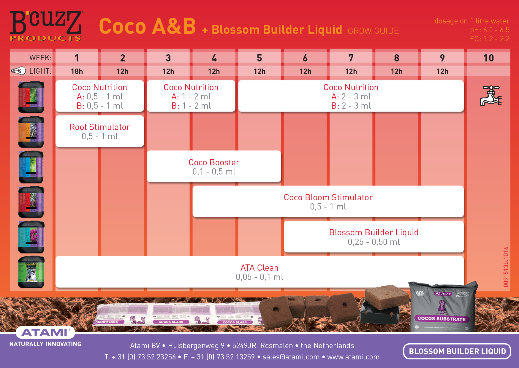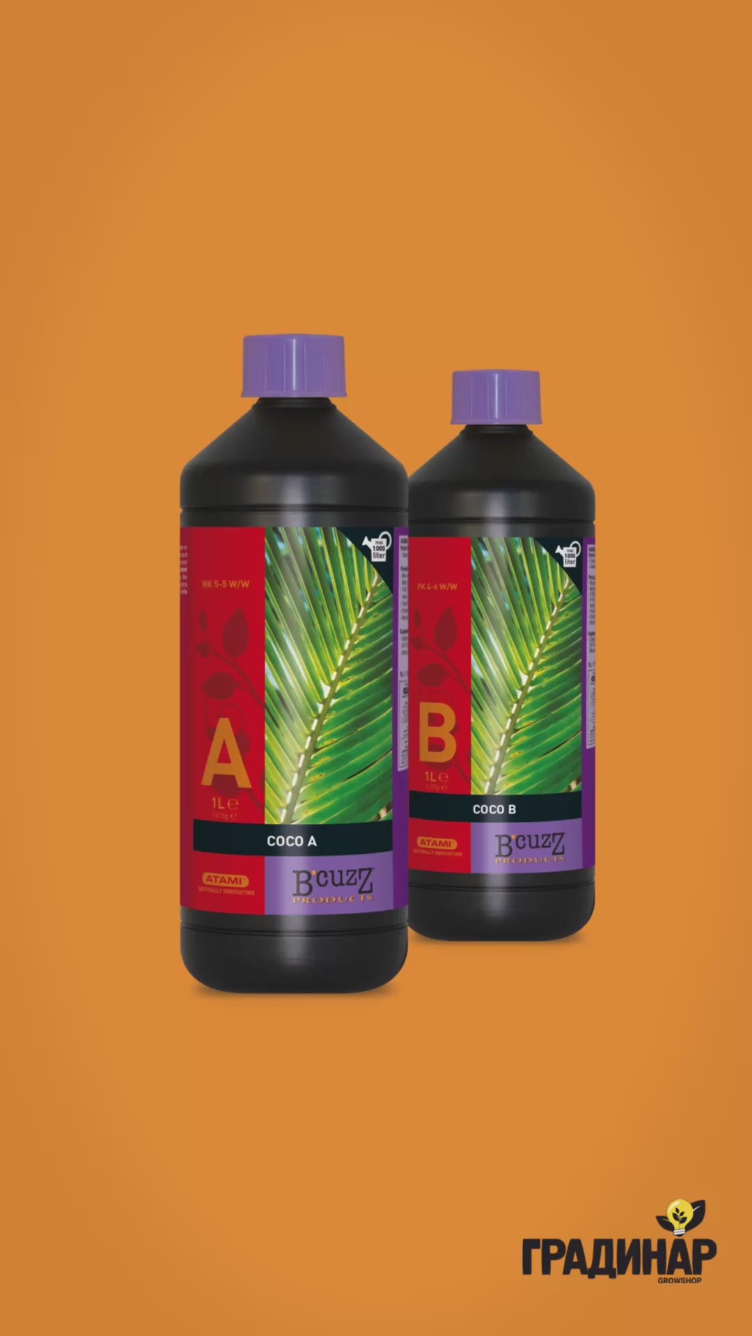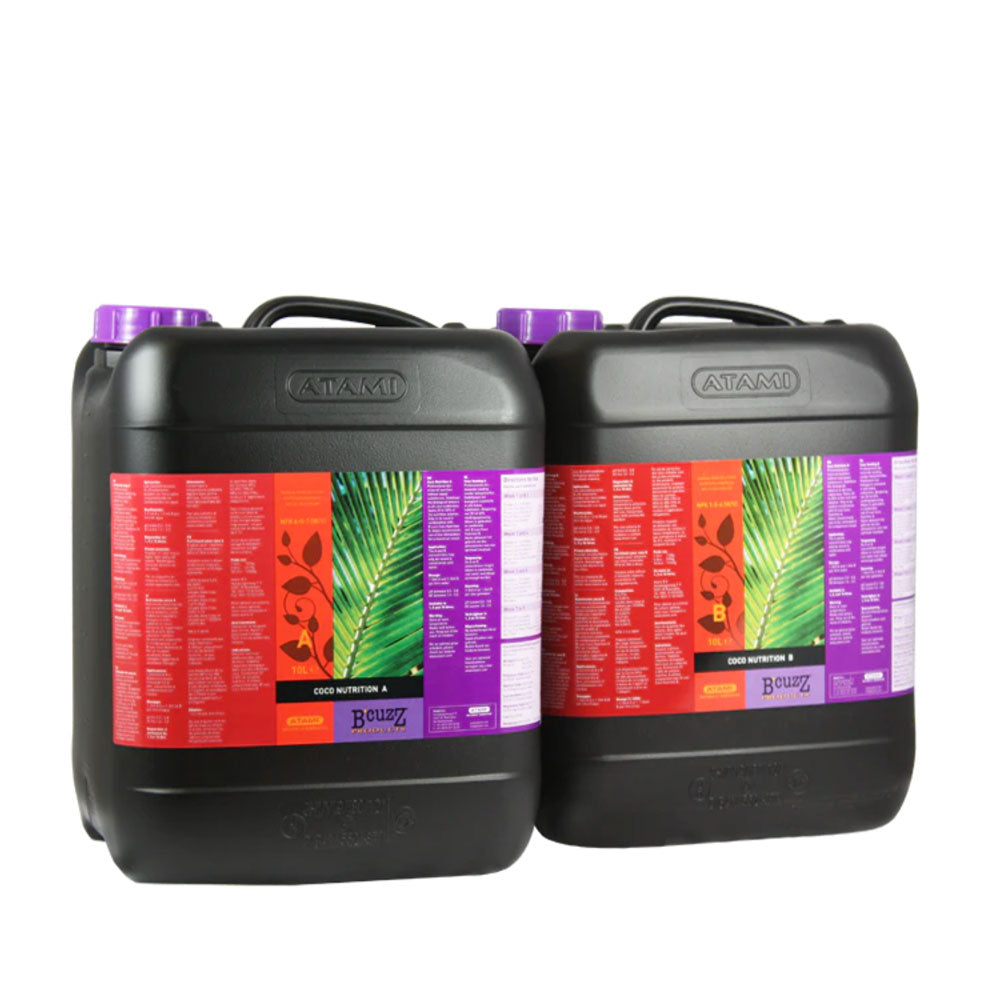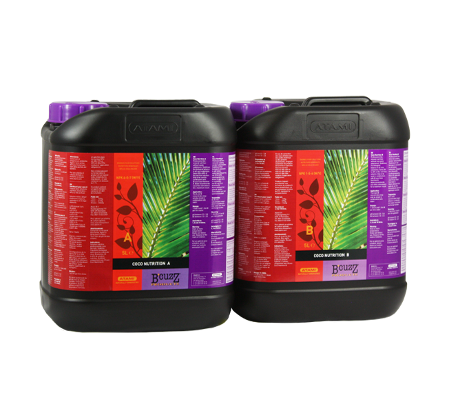 Кокосовите субстрати са все още много популярни като среда за култивиране. И това не е изненадващо, тъй като кокосовият орех има буферните свойства на почвата и прецизността на минерална вата. Тази комбинация е подходяща за правилния растеж и цъфтеж на растенията. Coco nutrition A&B спомага за още по-добро усвояване на кокоса от реколтата и също така осигурява биологичен баланс в кокосовия субстрат. Дозировка: 1 до 3 ml A и 1 до 3 B ml дневно на литър вода.