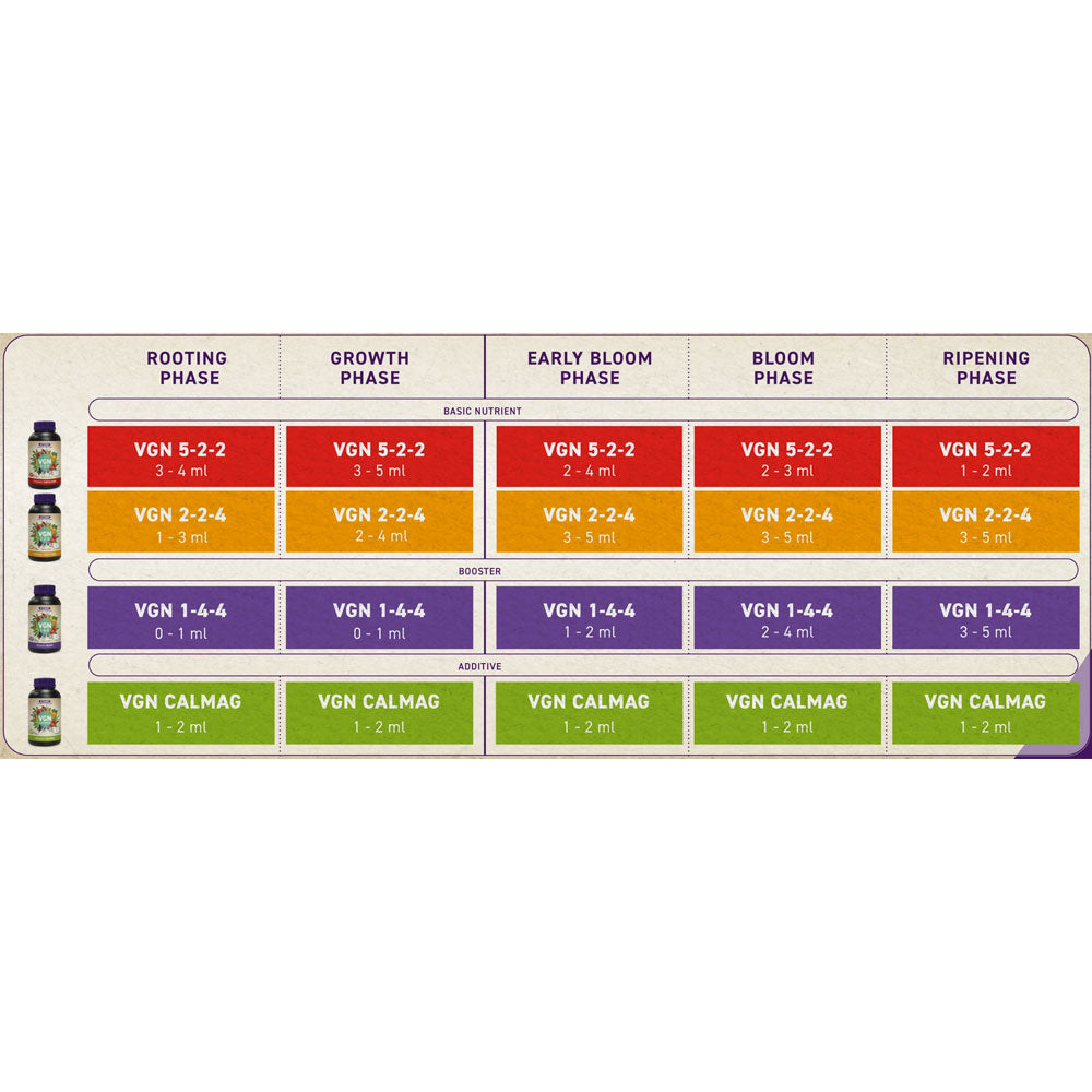 При смесване с чешмяна вода VGN 2-2-4 доставя всички жизненоважни компоненти за растеж. Комбинирайте с VGN 5-2-2 в адаптивни съотношения, за да отговорите на уникалните нужди на различни видове растения и етапи на развитие.