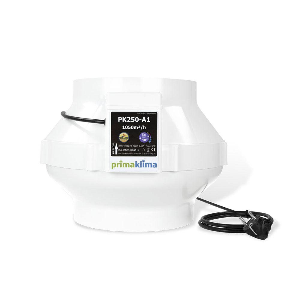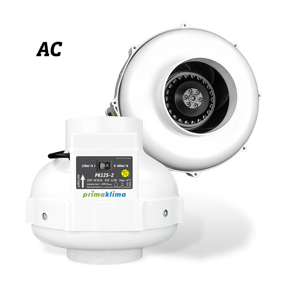 Primaklima AC Ventilators са едноскоростни вентилатори с термичен превключвател за предотвратяване от прегряване. Оборудвани са с променливотоков двигател ebm-papst с назад извити лопатки, който са оптимално адаптирани към корпуса. Целият корпус е изработен от силно удароустойчив, огнеустойчив полиамид (найлон). Дълготрайните сачмени лагери, които не се нуждаят от поддръжка, допринасят за особено плавната работа на двигателя.